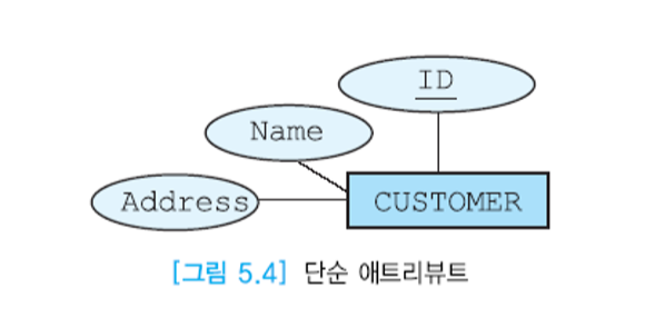 더 이상 다른 애트리뷰트로 나눌 수 없는 애트리뷰트로 ER 다이어그램에서 실선 타원으로 표현한다. ER 다이어그램에서 대부분의 애트리뷰트는 단순 애트리뷰트인 경우가 많다. 대부분의 단순 애트리뷰트는 단일 값 애트리뷰트이다. 단일 값 애트리뷰트는 각 엔티티마다 정확하게 하나의 값을 가지는 애트리뷰트를 의미한다. 예를 들면 학생의 학번 애트리뷰트는 어떠한 학생도 두 개 이상의 학번을 가지지 않으므로 단일 값 애트리뷰트이다.