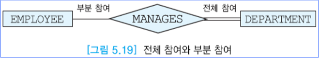 이와 비슷한 개념으로 전체 참여와 부분 참여가 있다. 전체 참여는 어떤 관계에 엔티티 타입 E1의 모든 엔티티들이 관계 타입 R에 의해서 어떤 엔티티 타입 E2의 어떤 엔티티와 연관되는 것을 의미한다. 부분 참여는 어떤 관계에 엔티티 타입 E1의 일부 엔티티만 참여하는 것을 의미한다. 약한 엔티티 타입은 항상 관계에 전체 참여로 표시되며, 전체 참여는 ER 다이어그램에서 이중 실선으로 표시된다.