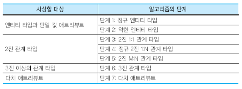 ER 모델을 릴레이션들로 사상하는 7개의 단계로 이루어진 알고리즘을 통해서 사상한다.
