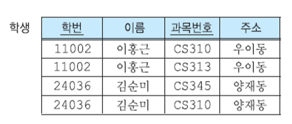- 여러 학생이 수강 중인 어떤 과목의 강사가 변경되었을 때 그 과목을 수강하는 모든 학생들의 투플에서 강사를 수정해야 한다.