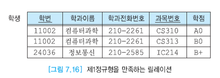 하지만 제1 정규형을 진행해도 갱신 이상이 존재할 수 있다. 아래 그림의 학생 릴레이션은 모든 애트리뷰트가 원자값을 가지므로 제 1정규형을 만족한다. 이 릴레이션의 기본 키는 (학번, 과목 번호)이다.