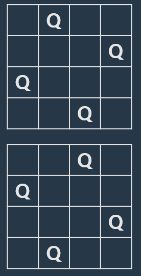 예를 들어서 n이 4인경우 다음과 같이 퀸을 배치하면 n개의 퀸은 서로를 한번에 공격 할 수 없습니다.