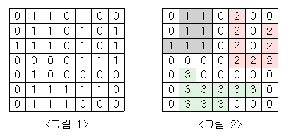 <그림1>과 같이 정사각형 모양의 지도가 있다. 1은 집이 있는 곳을, 0은 집이 없는 곳을 나타낸다. 철수는 이 지도를 가지고 연결된 집들의 모임인 단지를 정의하고, 단지에 번호를 붙이려 한다. 여기서 연결되었다는 것은 어떤 집이 좌우, 혹은 아래위로 다른 집이 있는 경우를 말한다. 대각선상에 집이 있는 경우는 연결된 것이 아니다. <그림2>는 <그림1>을 단지별로 번호를 붙인 것이다. 지도를 입력하여 단지수를 출력하고, 각 단지에 속하는 집의 수를 오름차순으로 정렬하여 출력하는 프로그램을 작성하시오.