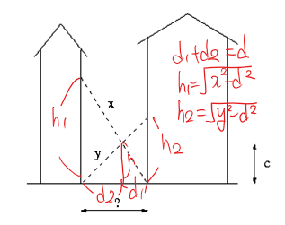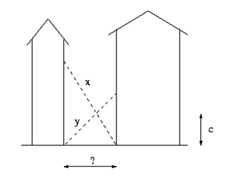 아래의 그림과 같이 높은 빌딩 사이를 따라 좁은 길이 나있다. 두 개의 사다리가 있는데 길이가 x인 사다리는 오른쪽 빌딩의 아래를 받침대로 하여 왼쪽 빌딩에 기대져 있고 길이가 y인 사다리는 왼쪽 빌딩의 아래를 받침대로 하여 오른쪽 빌딩에 기대져 있다. 그리고 두 사다리는 땅에서부터 정확하게 c인 지점에서 서로 교차한다. 그렇다면 두 빌딩은 얼마나 떨어져 있는 걸까?