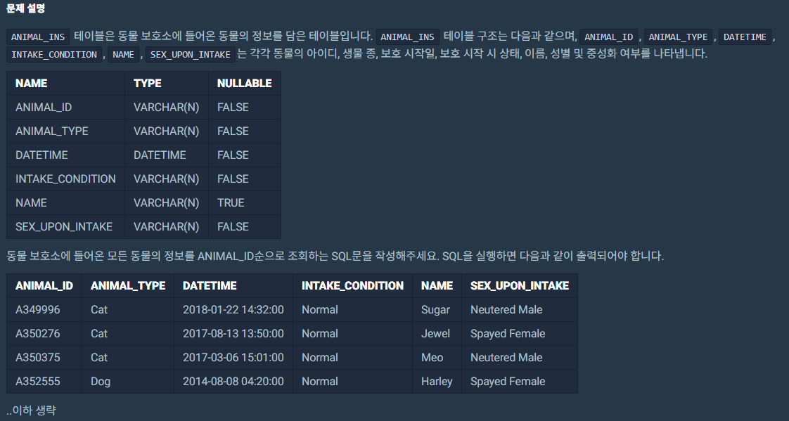 모든 정보를 조회하는 문제이므로 전체를 뜻하는 *를 SELECT 부분에 사용하면 된다. 다만 ANIMAL_ID순으로 조회하라는 조건이 있었으므로 ORDER BY ANIMAL_ID를 추가해주었다.