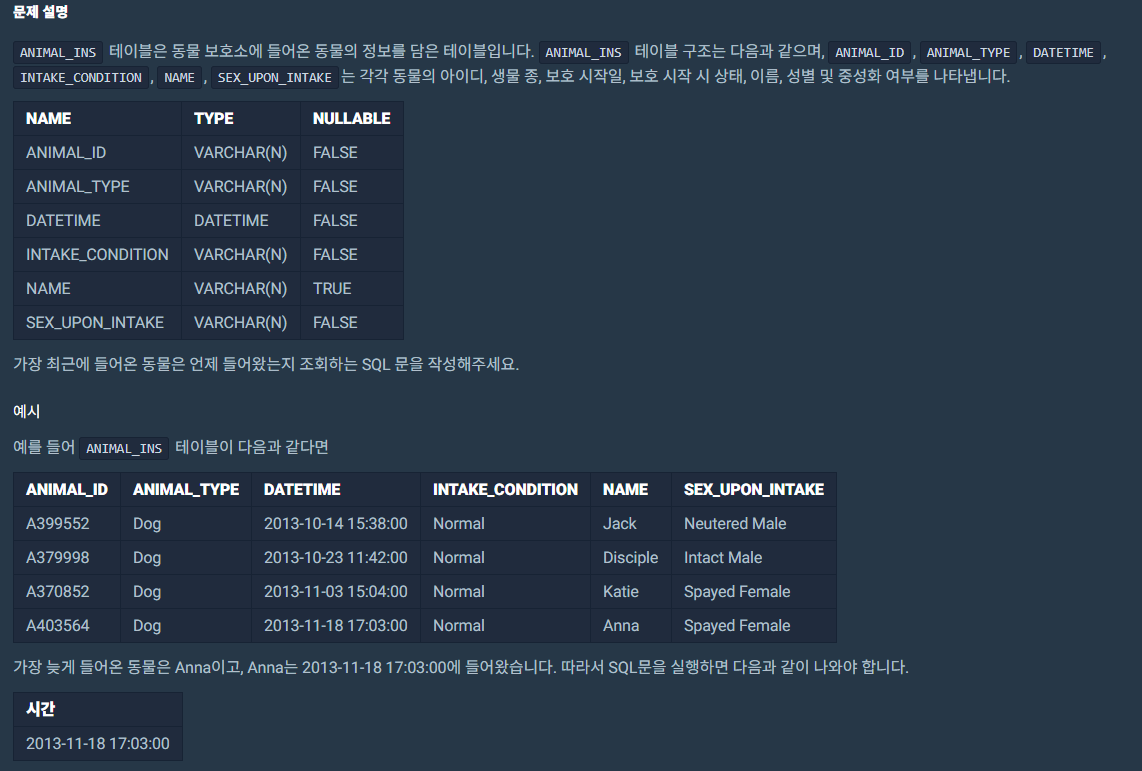 SELECT MAX(DATETIME) AS "시간" FROM ANIMAL_INS;