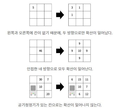 - 인접한 방향에 공기청정기가 있거나, 칸이 없으면 그 방향으로는 확산이 일어나지 않는다.