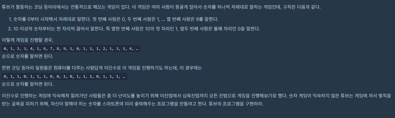 N진수 게임 튜브가 활동하는 코딩 동아리에서는 전통적으로 해오는 게임이 있다. 이 게임은 여러 사람이 둥글게 앉아서 숫자를 하나씩 차례대로 말하는 게임인데, 규칙은 다음과 같다. 숫자를 0부터 시작해서 차례대로 말한다. 첫 번째 사람은 0, 두 번째 사람은 1, … 열 번째 사람은 9를 말한다. 10 이상의 숫자부터는 한 자리씩 끊어서 말한다. 즉 열한 번째 사람은 10의 첫 자리인 1, 열두 번째 사람은 둘째 자리인 0을 말한다. 이렇게 게임을 진행할