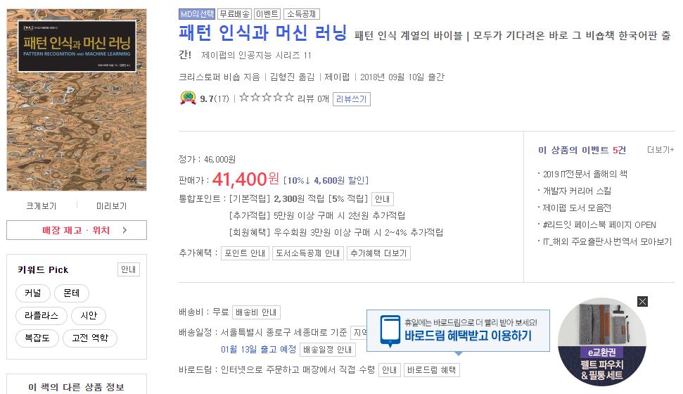기계 학습의 바이블이라고도 할 수 있는 책이다. 이번에 겨울방학 기간 동안 기계 학습, 딥러닝, 강화 학습에 대해서 공부를 할 예정인데 이 책을 바탕으로 공부를 하며 정리한 내용들을 업로드할 예정이다.
