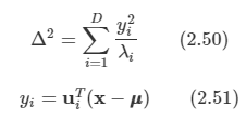 여기서의 △ 값은 u로부터 x까지의 마할노비스 거리라고 한다. 이 마할노비스 거리에서 공분산이 항등 행렬이 된다면 유클리디안 거리가 된다.