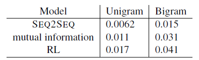 Li et al(2016a)에서 source와 target의 mutual information이 dull한 대답을 확실하게 줄이고, 일반적인 대답의 품질을 향상시켰다.