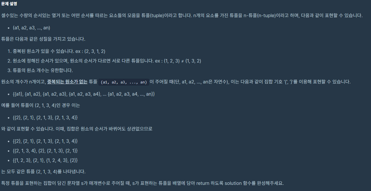 반복문으로 순환을 하면서 다시 ','을 기준으로 분리를 하면 숫자만 남게 되는데 이를 각 원소값이 int인 list로 tuples에 정리하게 된다. 이 단계까지 마치면 문자열을 규칙에 적용할 수 있도록 정리가 마무리 되었다.