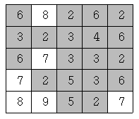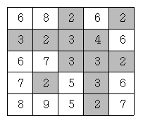 이제 위와 같은 지역에 많은 비가 내려서 높이가 4 이하인 모든 지점이 물에 잠겼다고 하자. 이 경우에 물에 잠기는 지점을 회색으로 표시하면 다음과 같다.
