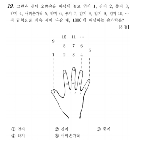 첫 번째 줄에 19번 문제 세 번째 줄에 등장하는 수 '1000'을 자연수 n으로 바꾸었을 때 그에 해당하는 답의 번호를 출력한다. 즉, 1 이상 5 이하의 자연수 중 하나를 출력해야 한다.