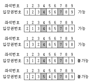 예를 들어서, 그림과 같이 좌석이 9개이고, 4번 좌석과 7번 좌석이 VIP석인 경우에 <123456789>는 물론 가능한 배치이다. 또한 <213465789> 와 <132465798> 도 가능한 배치이다. 그러나 <312456789> 와 <123546789> 는 허용되지 않는 배치 방법이다.