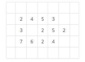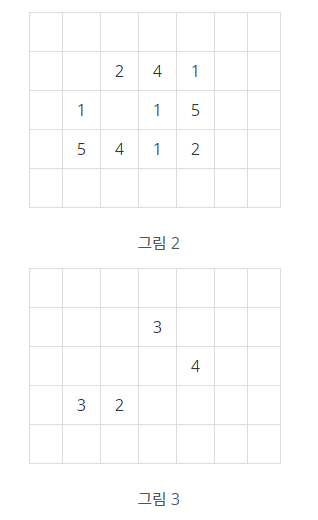 지구 온난화로 인하여 북극의 빙산이 녹고 있다. 빙산을 그림 1과 같이 2차원 배열에 표시한다고 하자. 빙산의 각 부분별 높이 정보는 배열의 각 칸에 양의 정수로 저장된다. 빙산 이외의 바다에 해당되는 칸에는 0이 저장된다. 그림 1에서 빈칸은 모두 0으로 채워져 있다고 생각한다.