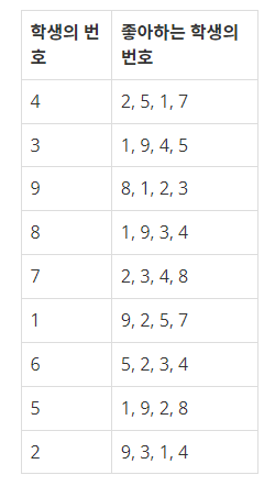 학생의 번호는 중복되지 않으며, 어떤 학생이 좋아하는 학생 4명은 모두 다른 학생으로 이루어져 있다. 입력으로 주어지는 학생의 번호, 좋아하는 학생의 번호는 N2보다 작거나 같은 자연수이다. 어떤 학생이 자기 자신을 좋아하는 경우는 없다.