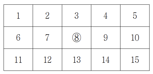 행의 수가 3이고 열의 수가 5인 격자에서 각 칸에 번호가 1부터 차례대로 부여된 예가 아래에 있다. 이 격자에서는 8번 칸에 ○ 표시가 되어 있다.