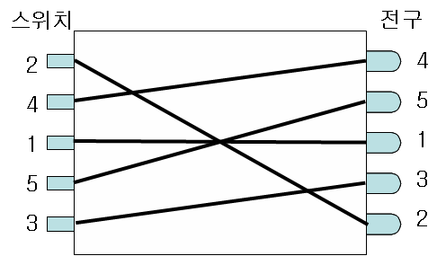 N개의 스위치와 N개의 전구를 가진 하나의 스위칭 박스가 있다. 이 박스의 왼편에는 스위치가 있고, 오른편에는 전구가 달려있다. 모든 스위치와 전구들은 1에서부터 N까지의 번호를 가지며 같은 번호의 스위치와 전구는 전선으로 서로 연결되어 있다.