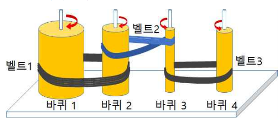 벨트 3은 바퀴 3과 바퀴 4를 0자 형태로 연결하며 바퀴 3이 2번 회전하는 동안 바퀴 4는 1번 회전하게 되므로, 바퀴 3을 시계 방향으로 2회전시키면 바퀴 4는 시계 방향으로 1회전하게 된다.