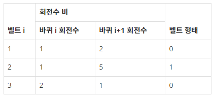 순차적으로 벨트를 이동하며 회전수를 구하면 된다. 회전방향과 같은 경우에는 1이 들어온 경우에만 바뀌므로 나머지 연산을 통해 방향을 바꾼다.