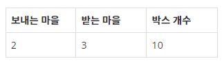 - 다음과 같이 박스들을 트럭에 싣는다. (1번 마을에서 4번 마을로 보내는 박스는 30개 중 10개를 싣는다.)
