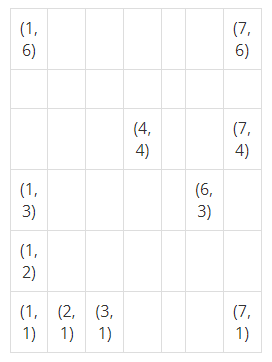 예를 들어보자. 아래 그림은 가로 7개, 세로 6개 좌석으로 구성된 7×6격자형 좌석배치를 보여주고 있다. 그림에서 각 단위 사각형은 개별 좌석을 나타내며, 그 안에 표시된 값 (x,y)는 해당 좌석의 번호를 나타낸다. 가장 왼쪽 아래의 좌석번호는 (1,1)이며, 가장 오른쪽 위 좌석의 번호는 (7,6)이다.