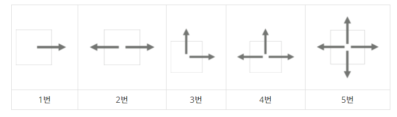 1번 CCTV는 한 쪽 방향만 감시할 수 있다. 2번과 3번은 두 방향을 감시할 수 있는데, 2번은 감시하는 방향이 서로 반대방향이어야 하고, 3번은 직각 방향이어야 한다. 4번은 세 방향, 5번은 네 방향을 감시할 수 있다.