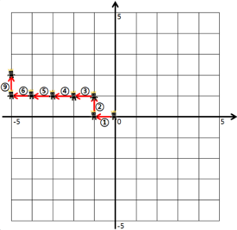 캐릭터는 좌표평면의 (0,0) 위치에서 시작합니다. 좌표평면의 경계는 왼쪽 위(-5,5), 왼쪽 아래(-5,-5), 오른쪽 위(5,5), 오른쪽 아래(5,-5)로 이루어져 있습니다.
