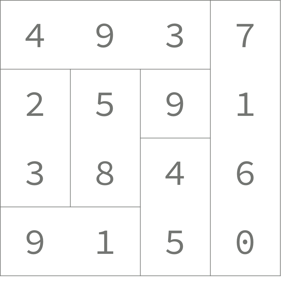 영선이는 직사각형을 겹치지 않는 조각으로 자르려고 한다. 각 조각은 크기가 세로나 가로 크기가 1인 직사각형 모양이다. 길이가 N인 조각은 N자리 수로 나타낼 수 있다. 가로 조각은 왼쪽부터 오른쪽까지 수를 이어 붙인 것이고, 세로 조각은 위에서부터 아래까지 수를 이어붙인 것이다.