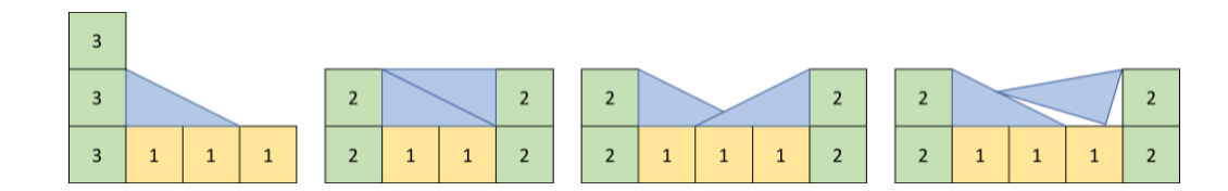 위의 그림의 가장 왼쪽부터 1번, 2번, 3번, 4번 예제라고 했을 때, 1번은 높이 차이가 1이 아니라서, 2번은 경사로를 바닥과 접하게 놓지 않아서, 3번은 겹쳐서 놓아서, 4번은 기울이게 놓아서 불가능한 경우이다.