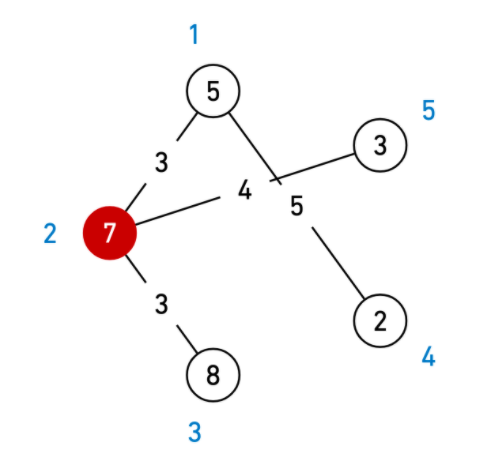 주어진 필드가 위의 그림과 같고, 예은이의 수색범위가 4라고 하자. ( 원 밖의 숫자는 지역 번호, 안의 숫자는 아이템 수, 선 위의 숫자는 거리를 의미한다) 예은이가 2번 지역에 떨어지게 되면 1번,2번(자기 지역), 3번, 5번 지역에 도달할 수 있다. (4번 지역의 경우 가는 거리가 3 + 5 = 8 > 4(수색범위) 이므로 4번 지역의 아이템을 얻을 수 없다.) 이렇게 되면 예은이는 23개의 아이템을 얻을 수 있고, 이는 위의 필드에서 예은이가 얻을 수 있는 아이템의 최대 개수이다.