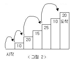 예를 들어 <그림 2>와 같이 시작점에서부터 첫 번째, 두 번째, 네 번째, 여섯 번째 계단을 밟아 도착점에 도달하면 총 점수는 10+20+25+20 = 75점이 된다.