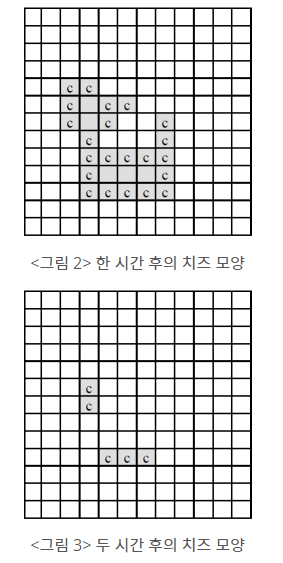 아래 <그림 1>과 같이 정사각형 칸들로 이루어진 사각형 모양의 판이 있고, 그 위에 얇은 치즈(회색으로 표시된 부분)가 놓여 있다. 판의 가장자리(<그림 1>에서 네모 칸에 X친 부분)에는 치즈가 놓여 있지 않으며 치즈에는 하나 이상의 구멍이 있을 수 있다.