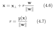 이 때 y(xA)=y(xB)=0를 만족하고, wT(xA−xB)=0다. 여기서 w는 결정 경계에 대해 수직임을 알 수 있다.