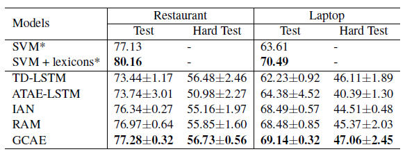 - ATAE-LSTM, IAN, RAM, MGAN, attention-equipped LSTM and fine-tuned BERt