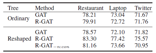 - R-GAT를 사용할 때 더 성능이 올라가는 것을 보이고, aspect-oriented로 reshape 했을 때 성능이 더 향상 되는 것이 보임