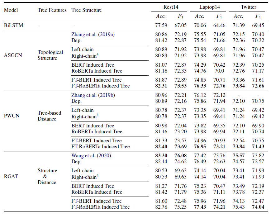 - LSTM+SynATT, AdaRNN, PhraseRNN, AS-GCN, CDT, GAT, TD-GAT
