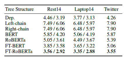 - 그래서 PTM에서 유도된 tree와 dependency parsing tree를 사용한 여러 유명한 모델을 비교해서 FT-RoBERTa로부터의 tree가 성능이 가장 좋음을 알 수 있다.