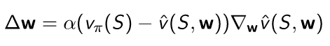 function approximation을 하는 방법은 어렵지 않다. 새로운 변수 w를 대입해서 이 변수가 table의 정보를 대변하도록 만들면 된다. 즉 다음과 같이 함수화 할 수 있다.