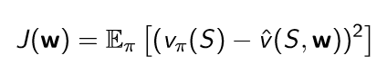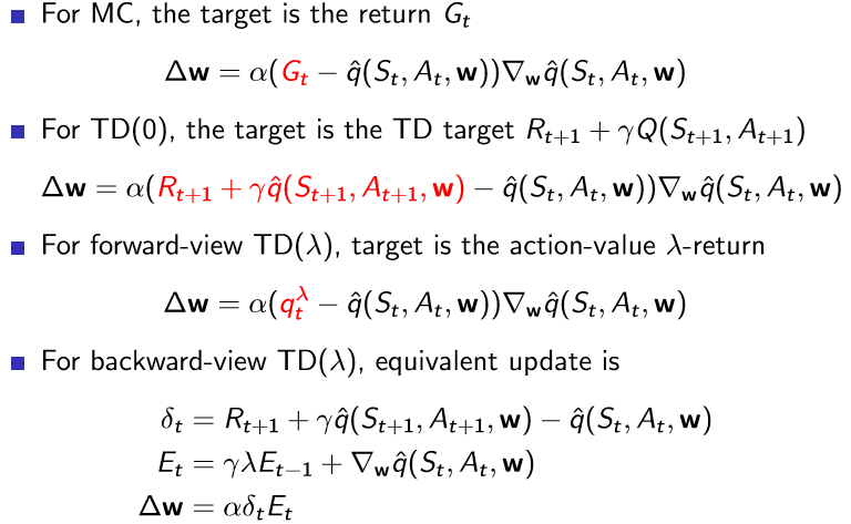 MC의 Gt는 unbiased 하고, true value의 noisy sample이다. 그러므로 training data를 지도학습으로 적용할 수 있다. 그래서 위와 같이 사용가능하며, local optimum으로 수렴하게 된다. 그리고 non-linear한 경우에도 적용할 수 있다고 한다.