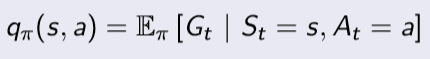 action value function은 현재 상태가 s이고, action a를 한다. 그리고 정책을 따른다고 했을 때, 얻을 수 있는 return의 기댓값을 의미한다.