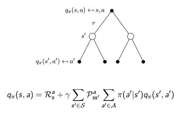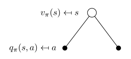 위 그림에서 흰색 원은 state를 의미하고, 검은색 원은 action을 의미합니다. 위 그림을 해석해 보면 현재 상태 s에서 가능한 action들은 2개가 있는 것입니다.(실제로는 더 많은 검은색 점이 있을 수 있습니다.) 그러면 agent가 선택한 당시의 정책에 따라 action을 할 확률이 정해질 것이고, 그 때마다 action-value function을 구할 수 있게 됩니다.