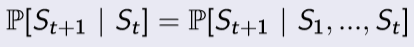 이전 강의에서 잠시 다뤘던 내용이다. "Markov하다" 라는 것은 다음 상태는 과거 상태에는 독립적이고 현재 상태에만 종속을 한다는 것이다. 즉 다음과 같다.