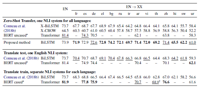 NLI는 sentence representation를 평가하는데 가장 많이 사용되는 방법이다. 두 문장이 주어지고 이 두 문장간의 관계를 파악하는 문제다. XNLI는 영어를 다른 언어로 번역을 한 뒤에 NLI 과정을 거치는 평가방법이다. 이를 BERT와 비교해보았을 때, 영어 단일 NLI에 대해서는 성능이 좋지 못했지만 이를 다른 언어로 번역한 뒤에 성능을 평가했을 때에는 더 좋은 성능을 얻었다.