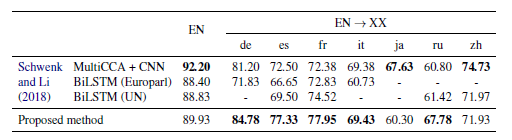 이것은 영어로만 되어 있는 데이터를 가지고 resulting embedding의 top의 classifier를 배울 수 있고, 이 것을 수정없이 93개 언어로 전이 가능하다.