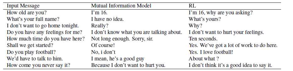 mutual information이 SEQ2SEQ보다 더 긴 대화를 나누었고, mutual information으로 훈련을 하고 RL의 장점을 추가한 RL 모델이 가장 좋은 결과를 얻었다.
