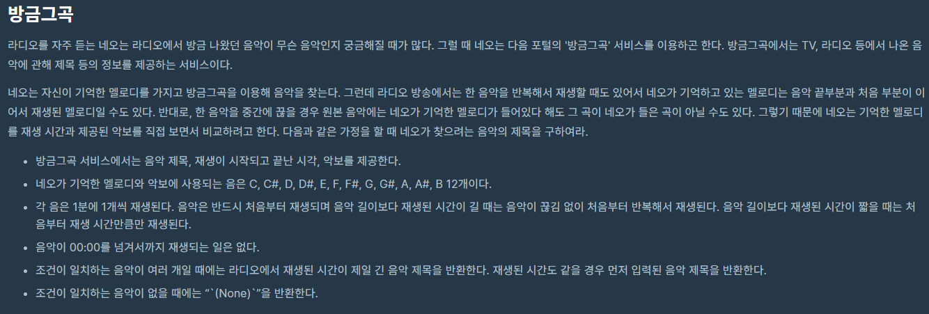 이 문제에서 처리해야 할 것은 크게 두 가지이다. 재생된 시간의 길이에 따라서 음이 달라지므로 시간 형식으로 되어 있는 자료형을 분 단위로 바꿔야 한다. 그리고 음계 중에 C#, D#, F#, G#과 같이 #이 붙어 있는 음계가 있는데 스트링 형식으로 되어 있기 때문에 이들도 하나의 인덱스를 차지하고 있으므로 처리하는 방법에 대해서 생각해야 한다.