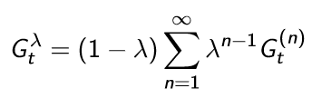 MC와 TD의 절충안이 n-step인 것처럼, 여러 개의 n-step을 선택하여 이의 평균을 취하면 각 n-step의 장점을 모두 가질 수 있게 된다. 이 때, 단순히 산술평균을 사용하는 것이 아니라 λ라는 weight를 이용해서 가중 평균을 취하도록하고 이를 Forward-view라고 한다.