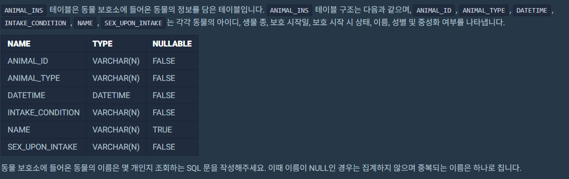 중복을 제거해주는 명령어인 DISTINCT를 사용해야 하는 문제이다. 우선 NULL인 경우는 집계하기지 않으므로 WHERE 조건절을 통해서 NULL이 아닌 값을 걸러내고 DISTINCT NAME을 통해서 중복되는 값을 지우고 이를 COUNT 하는 방법으로 진행했다.